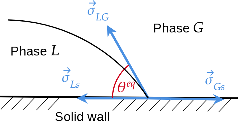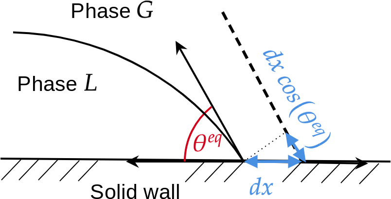 When a liquid (phase \(L\)) and a gas (phase \(G\)) are in contact with a solid wall, there is an equilibrium angle \(\theta^{eq}\) corresponding to the equilibrium of three capillary forces \(\vec{\sigma}_{Ls}\) the capillary force between Liquid and solid, \(\vec{\sigma}_{Gs}\) the capillary force between Gas and solid, and \(\vec{\sigma}_{LG}\) the capillary force between Liquid and Gas (see Fig. Contact-Angle-Concept). The contact angle \(\theta^{eq}\) can be expressed with the three surface tensions by the Young-Dupré law. Its derivation (see [1]) can be performed with the work \(d\mathcal{W}\) of a small displacement \(dx\) (see Fig. Young-Dupre-Derivation):