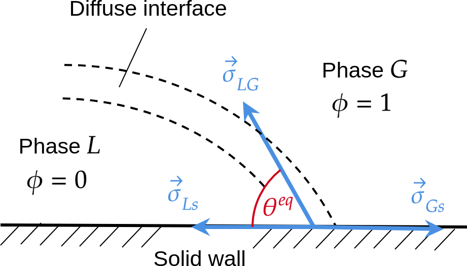where \(\hat{\boldsymbol{n}}\) is the normal vector at the wall boundary. After using the Young-Dupré law, we obtain the boundary condition for the phase-field \(\phi\) at the solid surface: