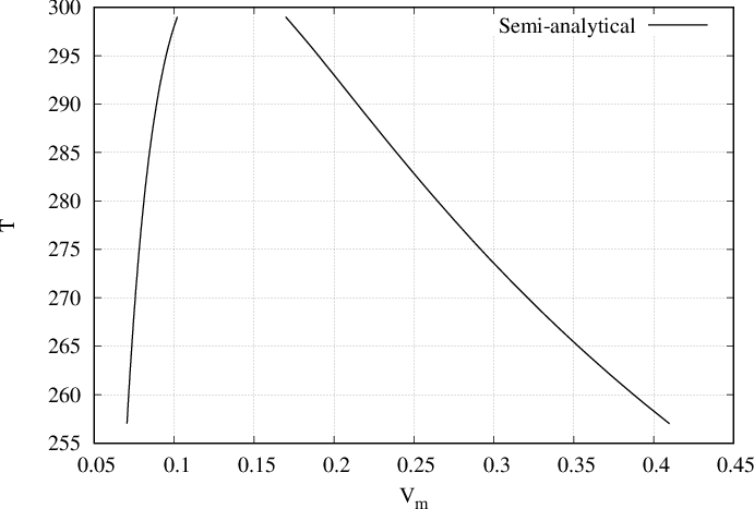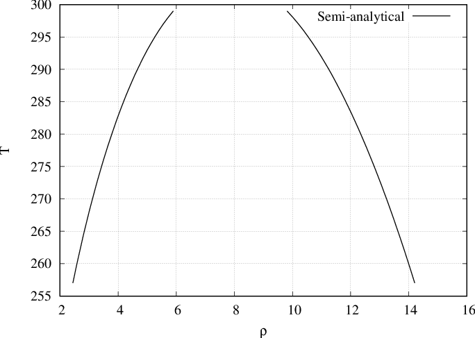 By solving semi-analytically we obtain the equilibrium densities (or coexistence densities) of bulks \(\rho_l\) and \(\rho_g\) for several temperatures as presented in Fig. 53 and Fig. 54. For example, on Fig. 53, at \(T=280\) two fluids will coexist. The first one density \(\rho_g \approx 4\) and the second one of density \(\rho_l \approx 12\).