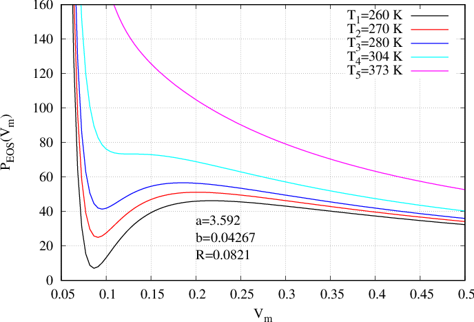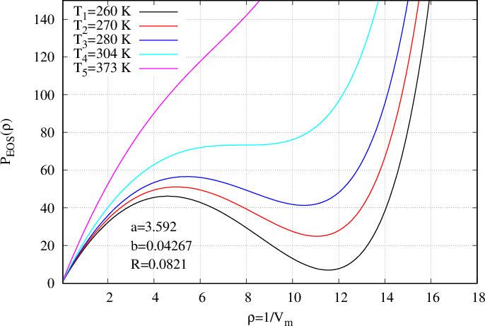 where \(a\) represents attractive interactions which modify the pressure and \(b\) corresponds to the excluded volume occupied by hard sphere atoms. Those interactions can be described by interactomic potential, e.g. Lennard-Jones. Expressed with density, that Equation of State writes: